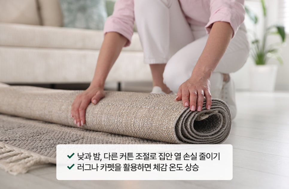 거실이나 침실에는 러그나 카펫을 깔면 바닥의 열이 오래 머물러 체감 온도가 2~3℃ 정도 높아집니다.