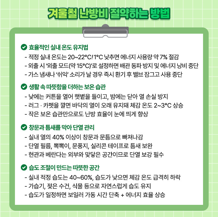 작은 점검과 꾸준한 관리만으로도 올겨울 난방비 절약과 안전을 모두 챙길 수 있습니다.