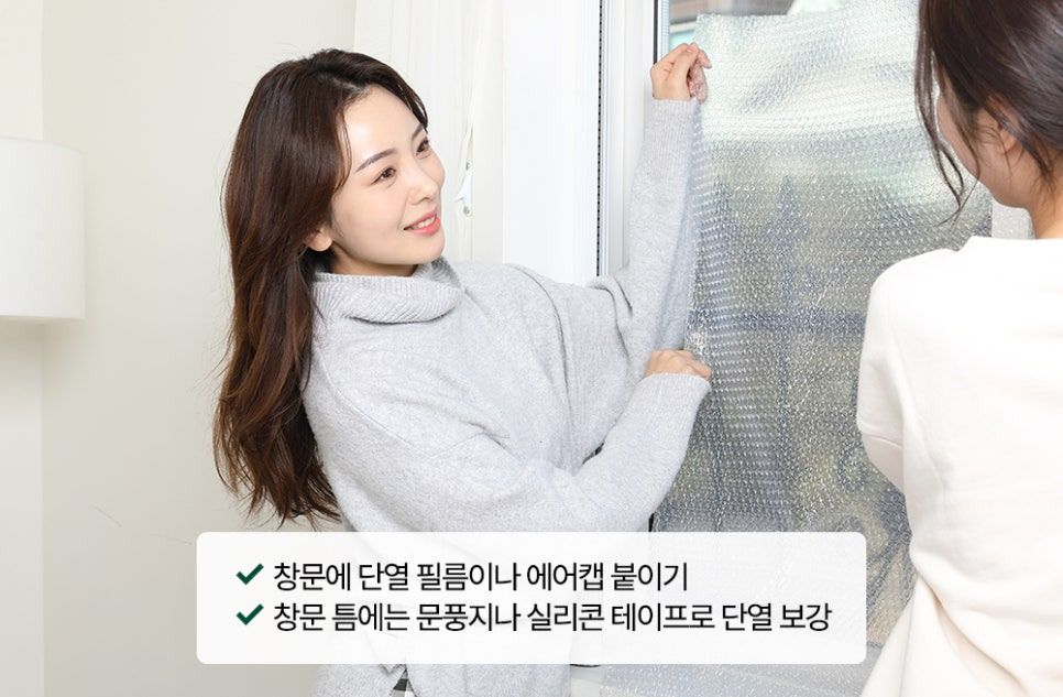 창문에는 단열 필름이나 뽁뽁이(에어캡)을 붙이고, 틈이 벌어진 곳은 문풍지나 실리콘 테이프로 보완하세요.