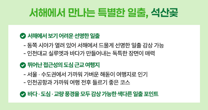서울 및 수도권 접근성이 뛰어나 도심 가까운 해돋이 여행지로 인기가 높으며, 인천공항과 가까워 여행 전후로 잠시 들르기 좋은 코스로도 사랑받고 있습니다.