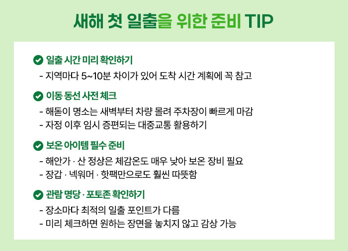 특히 해안가와 산 정상은 체감온도가 매우 낮기 때문에 장갑, 넥워머, 핫팩 같은 기본 아이템만 있어도 훨씬 따뜻하게 새해를 맞을 수 있습니다.