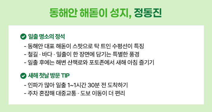 또, 장소마다 일출이 가장 잘 보이는 포인트가 다르니 미리 포토존 위치나 관람 명당을 확인해두면 원하는 장면을 놓치지 않고 담아낼 수 있습니다.