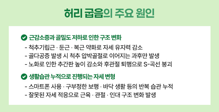 허리가 굽는 이유가 단순한 근력 부족이 아닐 때가 많기 때문이죠.