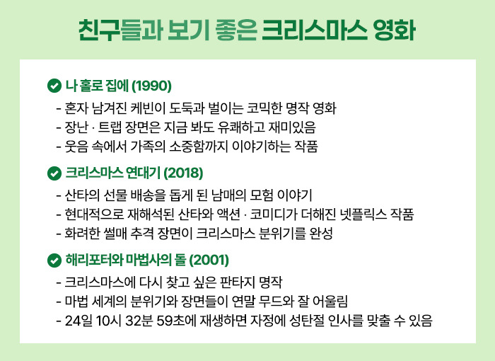 올해도 그 분위기를 더해줄 영화들과 함께 크리스마스를 맞이해보세요. 🎄✨