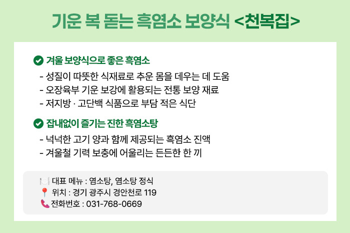 ‘검은 보약’이라 불리는 흑염소는 성질이 따뜻해 겨울철 보양식으로 특히 잘 어울립니다.
