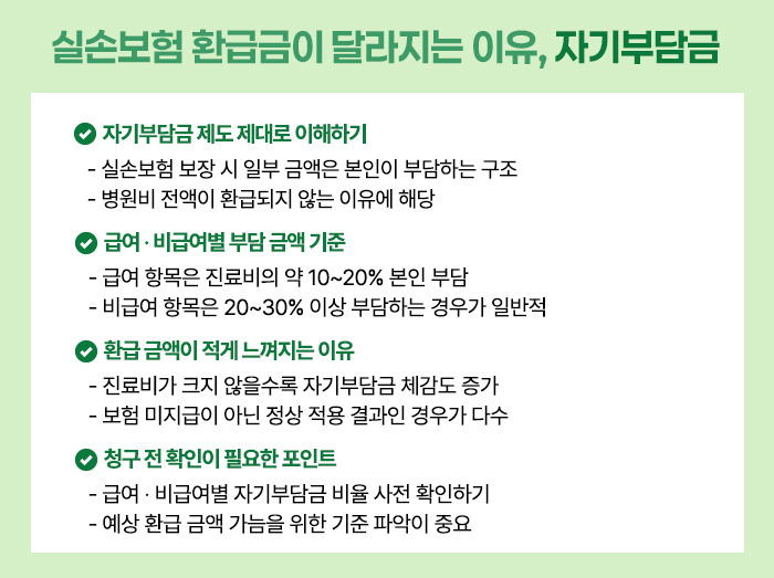 실손보험은 급여·비급여의 구분, 자기부담금 비율, 청구 기준을 얼마나 정확히 이해하고 있느냐에 따라 환급 금액이 크게 달라지는 보험입니다.
