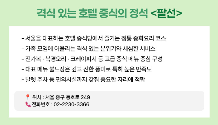 팔선은 서울을 대표하는 호텔 중식당으로, 정통 중화요리를 코스 중심으로 경험할 수 있는 곳입니다.