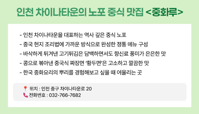 인천 차이나타운에서 중화요리의 시작을 직접 느껴보고 싶을 때, 중화루는 한 번쯤 들러볼 만한 곳입니다.
