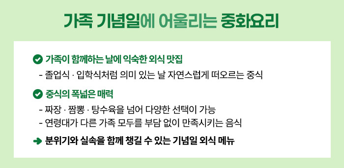 졸업식이나 기념일처럼 의미 있는 날, 평소보다 조금 더 신경 쓴 메뉴를 고민하고 있다면 오늘 소개한 중화요리 맛집을 참고해 보셔도 좋겠습니다.