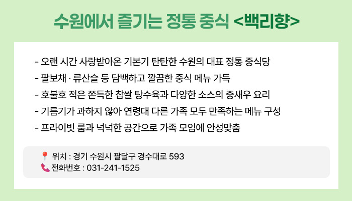 수원 백리향은 오랜 시간 꾸준히 사랑받아온 정통 중식당입니다.