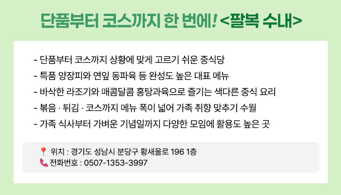 팔복 수내는 정통 중화요리를 부담 없이 즐길 수 있으면서도 메뉴 완성도가 높은 중식당입니다.