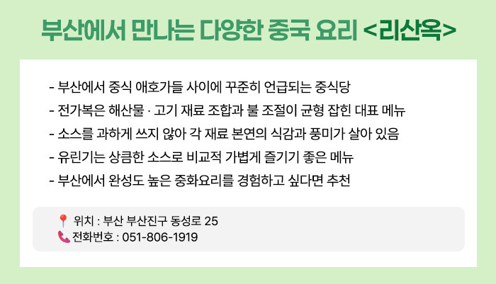 부산에서 조금 더 완성도 높은 중화요리를 즐기고 싶을 때, 리산옥은 충분히 고려해 볼 만한 중식당입니다.