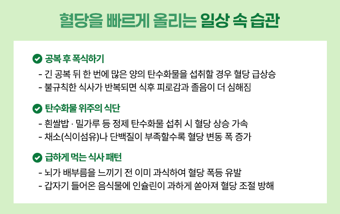 아침을 거르거나 공복 시간이 길어진 뒤 한 번에 많은 양을 먹는 습관은 혈당을 빠르게 올릴 수 있습니다.
