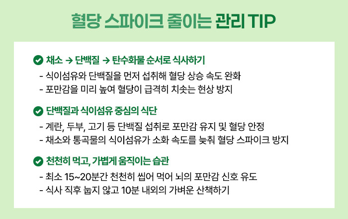 과식을 하지 않으면 식사 후 혈당이 갑자기 크게 올라가는 상황도 줄어들 수 있습니다.