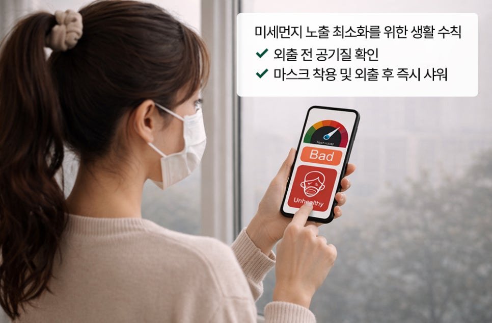 외출 후에는 즉시 샤워하고 머리를 감아 피부와 모발에 묻은 미세먼지를 빠르게 제거하는 것이 중요합니다.
