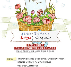 참좋은이벤트 썸네일형 리스트형 [5월 문화이벤트] 나를 위한 감성충전의 시간! 가정의 달 이벤트 안녕하세요! 행복한:D예요! 가정의 달 5월이 찾아왔어요! 가족들과 행복한 시간 보내고 계신가요?5월 초에는 기념일이 무척 많은 것 같아요. 어린이날, 어버이날, 스승의 날까지.기념일마다 선물 고르느라 고민 많이 했지만, ‘왜 나를 위한 선물은 없을까?’ 하며 속상하진 않으셨나요? 지금 미듬씨가 여러분을 위해 선물을 가지러 가요!그런데 미듬씨 앞에 어렵고 복잡한 미로가 나타났어요.이 미로를 통과해야 여러분께 선물을 전해 드릴 수 있어요.미듬씨는 이 미로를 통과하면서 몇 개의 선물을 주웠을까요? 미듬씨가 주운 선물 개수를 이름, 전화번호 뒷자리와 함께 비밀 댓글로 남겨주세요!단! 쓰레기, 종이, 돌은 주우면 안돼요!!정답을 맞춰주신 여러분께 행복한:D와 미듬씨가 준비한 선물을 보내드릴게요~ 이벤트 기간은 .. 더보기 [4월 문화이벤트] 미리 준비하는 어버이날! 꽃바구니와 손편지 배달 이벤트! (마감) 안녕하세요, 행복한:D입니다~ 어느덧 추운 겨울이 지나고 벚꽃이 예쁘게 꽃망울을 피우는 4월이 왔어요!본격적인 봄이 시작되는 4월이 지나면 가정의 달 5월이 오는데요,행복한:D는 벌써부터 어버이날 어떤 선물을 해야 될지 고민이랍니다. 항상 끊임없는 사랑을 주시는 부모님에게 이번 어버이날은 용돈, 선물이 아니라따뜻한 편지와 꽃바구니를 선물하는 것은 어떨까요?실제로 행복한:D의 부모님은 작년에 받은 꽃바구니를 아직도 말려서 보관할 정도로 좋아하셨답니다! 부모님께 꼭 전하고 싶은 감사편지를 이름, 전화번호 뒷자리와 함께 비밀댓글로 남겨주세요!여러분의 진짜 마음을 행복한:D가 직접 적어 5월 8일 어버이날 꽃바구니와 함께 전달 드릴게요~ 이벤트 기간은 4월 6일~4월 26일까지 진행되니 많은 참여 부탁 드릴게요! 더보기 이전 1 ··· 19 20 21 22 다음