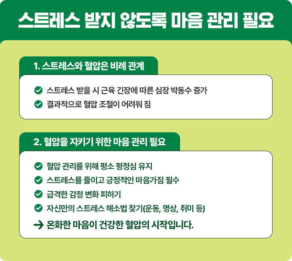 과도한 스트레스로 근육의 긴장이 증가하고 심장 박동수가 증가하면 혈압이 잘 조절되지 않습니다. 골치 아픈 일이 생기면 뒷목을 잡으며 혈압 오른다고들 하듯이, 스트레스가 혈압에 미치는 영향을 일상에서도 자주 경험할 수 있습니다.