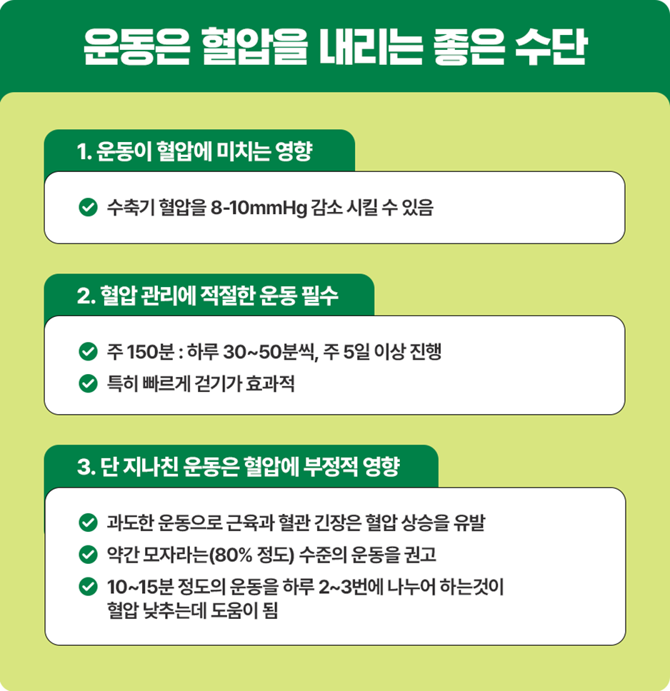 체중 감량을 목표로 기름진 음식과 식사량을 과하게 줄인 상태에서 1시간 이상의 운동을 하면, 특히 근력 운동이 지나칠 경우에는 근육과 혈관의 긴장을 가져와 오히려 혈압이 더 오를 수 있습니다. 따라서 혈압 관리를 위해서는 지나친 운동보다는 약간 모자라는(~80%) 정도의 운동을 권고합니다. 10~15분 정도의 운동을 하루 2~3번에 나누어 하는 것도 혈압을 낮추는 데 도움이 됩니다.