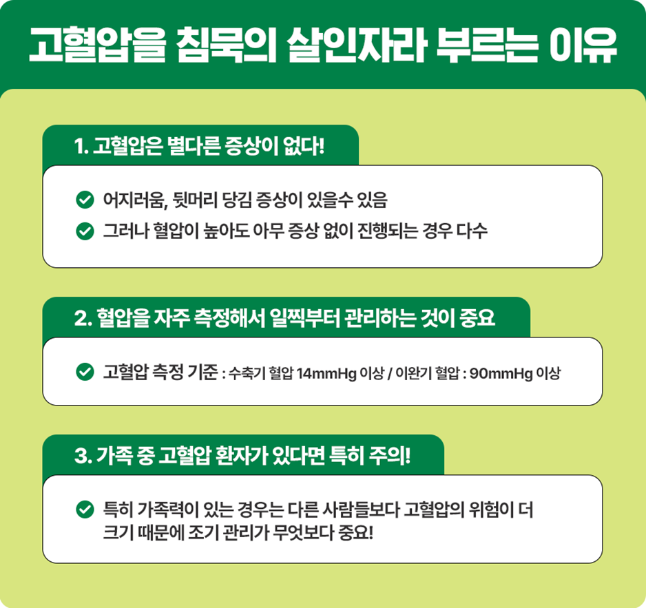 고혈압은 갑작스러운 뇌졸중, 심근경색의 주원인이자 뇌혈관질환, 심혈관질환의 가장 중요한 위험 요인이기 때문에 항상 주시하면서 관리하는 노력이 필요합니다.