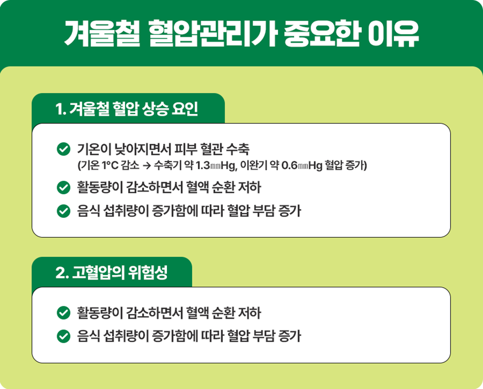 겨울철에 혈압이 높아지는 이유는 낮은 기온으로 피부 혈관이 수축하고, 활동량이 감소하는데 음식 섭취량은 증가하기 때문입니다. 사람마다 다르겠지만 보통 기온이 1℃ 떨어질 때마다 수축기 혈압은 약 1.3㎜Hg, 이완기 혈압은 약 0.6㎜Hg 올라간다고 합니다.